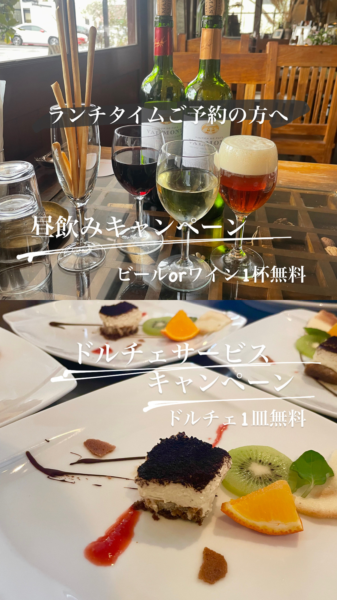 ご予約の際「昼飲みキャンペーンで」または「ドルチェキャンペーンで」とお伝えくださった方が対象となりますので、お忘れなくお伝えください。